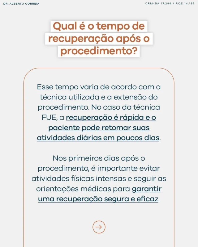 Um dos grandes diferenciais da Dr. Alberto Correia - Transplante Capilar é o tempo de recuperação dos procedimentos. Graças à técnica avançada de transplante capilar tipo fue, os pacientes conseguem voltar à rotina em poucos dias, sem dor ou inchaço significativos.