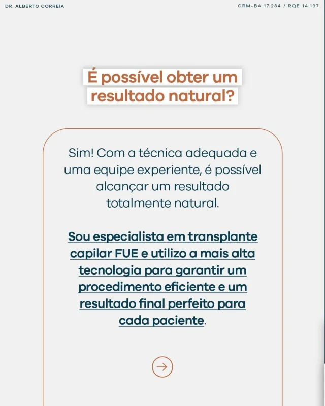 O Dr. Alberto Correia, formado pela UFBA e com especialização em cardiologia, é referência nacional em transplante FUE e DHI, garantindo aos pacientes resultados de alta qualidade e satisfação.
